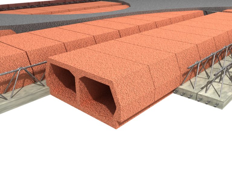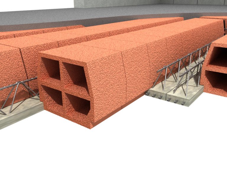 - zużycie betonu na budowie – 0,097 m3/m2stropu (bez betonu w żebrach rozdzielczych, wieńcach i innych uzupełniających elementach stropu wykonywanych z betonu monolitycznego);